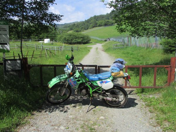 この後、三度工事人に愛想を振りまき、入笠牧場のゲートまで戻る。ゲートは、牛を逃がさないために閂がかかっているが、鍵はかかっていないので自分で開けて通過。