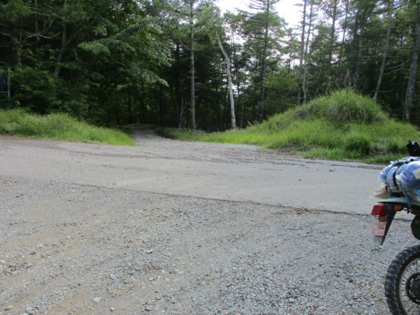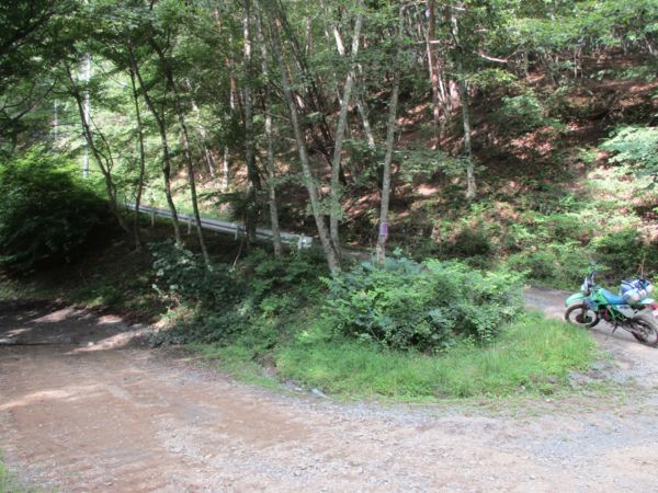 芝平峠到着、十字路になっている。上手に写真が撮れていないが、KDXの前方が本日の宿泊地、千代田湖キャンプ場に向かう舗装路。右手、「青柳」と書いてある方向が金沢併用林道、