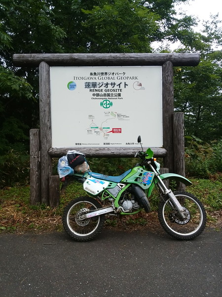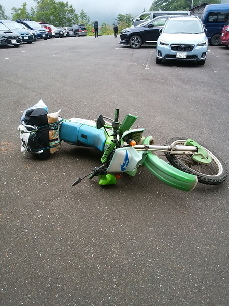 KDXなんていつもなら軽々と持ち上がるのだが、満載の荷物(しかも重心から遠い)が意外と重い、持ち上がらない。荷物を卸すしかないかなぁと考えていると、「私もセローに乗るんです」というご婦人が起こすのを手伝ってくれました。その節は、ありがとうございました。次回お会いしたら、お酒奢ります。