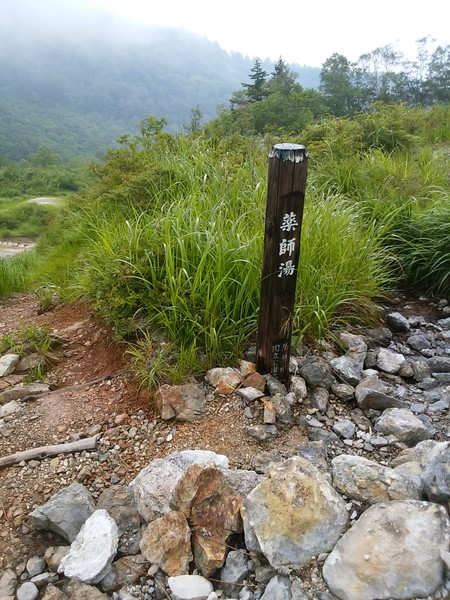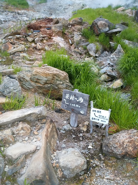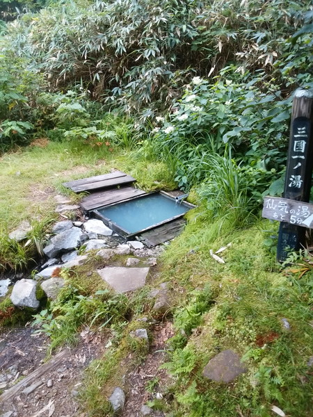 登山道を反徒時計回りに、まずは三国一ノ湯。これは本当に道端だった。湯舟は1m余り四方、更衣室なぞ当然無い(この後も同じ)。一瞬躊躇したが、誰も来ない、足音もしないことを確かめて、脱ぐ。当然全裸である。だがしかし、マッパになった瞬間に、女性登山者が現れるのはお約束だった。お互い気まずく視線をそらしながら、とりあえず入浴。ん~、ぬるい。展望もきかない(ただの道端)ので、次へ。