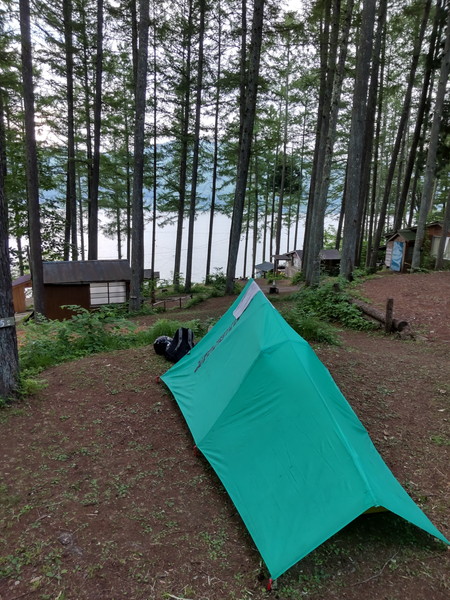 湖が見えてロケーションも良かったけど、下の若者達がちょっとうるさかったかな。そうそう、夜はテントの中へひょんな来客もあったっけ。