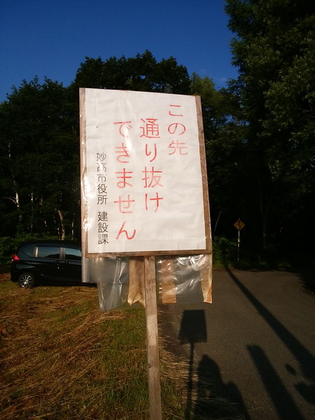 元の道へ戻ると、やる気のない通行止めの看板(だけ)。通り抜けできないかどうか、確かめてみましょう。