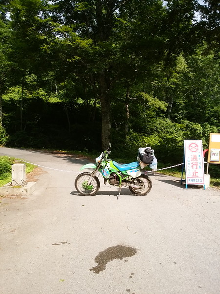 2日分の汗を流したら、長野県道114号川尻小谷糸魚川線を西へ向かう。が、しかし。ちょうど鎌池のところで工事中通行止め。