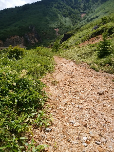 登山道を反徒時計回りに、まずは三国一ノ湯。これは本当に道端だった。湯舟は1m余り四方、更衣室なぞ当然無い(この後も同じ)。一瞬躊躇したが、誰も来ない、足音もしないことを確かめて、脱ぐ。当然全裸である。だがしかし、マッパになった瞬間に、女性登山者が現れるのはお約束だった。お互い気まずく視線をそらしながら、とりあえず入浴。ん~、ぬるい。展望もきかない(ただの道端)ので、次へ。