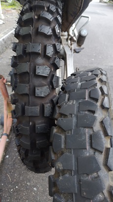 続いて、終わっているDJEBELの前後タイヤをKDXのものに交換(なんとリアは新品)。ところがここで問題発生。フロントは着いたものの、ジェベルのリアは硬くて外れない!あれこれ粘るもついにあきらめ、ショップへ持ち込み交換。メカニック曰く、硬かった、とのこと。
