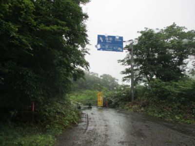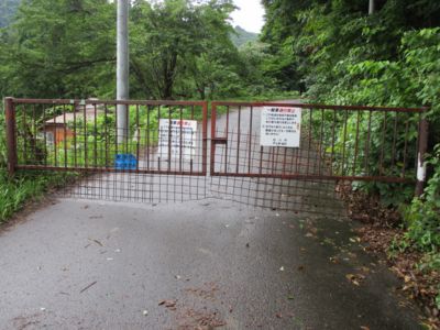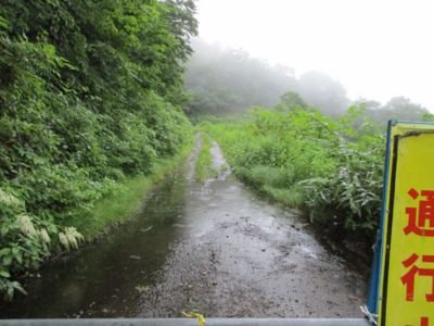 施設を過ぎてほどなく行くとゲート出現。開いてはいるけど、「通行止」の文字にアドレナリンが出始める。さて、どこまで行けるか? ちなみに、このゲートが閉まっていると、KDXでも厳しい。