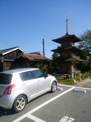 鶉野見学の起点は、北条鉄道法華口駅。お供はスイフトである。北条鉄道は小野市の粟生と加西市の北条町を結ぶ第三セクターである。ミニ三重塔は、近隣の国宝の模造品らしい。