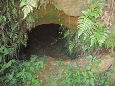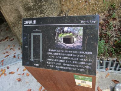 最初にやってきたのは倉庫わきの弾薬庫。解説板は爆弾庫、となっているが、弾薬庫の方がよいと思う。入り口には鉄柵があり、中には入れない。意外とこじんまりとしているので、格納されていたのは機銃弾、小銃、小銃弾程度の大きさのものかもしれない。800kg(海軍では80番といった)爆弾はそう数が入らないし、魚雷に至ってはもっと怪しい。もっとも、少量ずつ分散していたのかもしれないが。