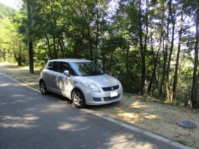 航空隊正門へ向かう道はこのように整備されている。スイフトの右側が高くなった土手で、防空壕が口を開けているところだ。左手は崖。
