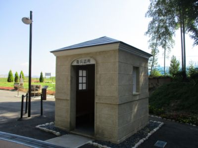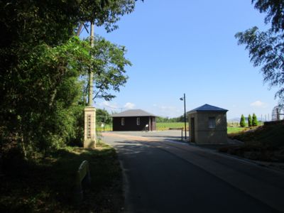 航空隊の正門、門柱と衛兵詰所。もちろん全て復元。少し躊躇したが、どうやらこのまま車で抜けてもかまわないらしい。