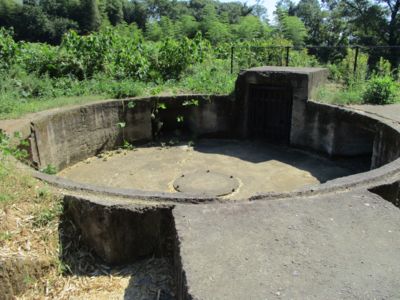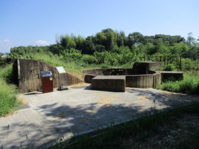 ちょっとだけ離れた、池のふちにある対空機銃座跡。解説板からここにあったのは25mm連装機銃、とあるので制式名称「九六式二十五粍機銃」があったのだろう。鶉野の戦跡全般に言えることだが、紫電改関連を除き、少し調べればわかることに対しても非常に考証が甘い。