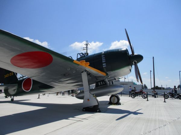 冒頭で紫電改を製造した川西航空機は元々水上機メーカーだったと書いたが、紫電改も元をただせば川西が設計した水上戦闘機強風である。大雑把に言うと、水上機である強風からフロートを取り去り脚を追加し、エンジンを1500馬力級の火星から2000馬力級の誉へ換装して紫電という戦闘機を作り上げた。その紫電から、主翼を低翼(強風/紫電は中翼)とし、細部の設計を見直したのが紫電「改」(紫電二一型)である。終戦までに数百機が生産され、最も(そして唯一)有名なのは四国の松山基地に展開した343航空隊である。実大模型は、343航空隊の戦闘第301飛行隊を再現している。それにしてもよくできていると思うし、さすがは2000馬力級の戦闘機である。靖国神社にもある零戦とは、迫力が違う。