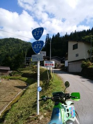 41号を北上、高山市でバイパスが通れない(自動車専用道路。KDXは125なので原付)というハプニングがあったものの、飛騨古川で給油(1回目)、41号から471号へ分岐して、さらに360号との分岐が今日のスタートライン(36.306416, 137.092095)である。