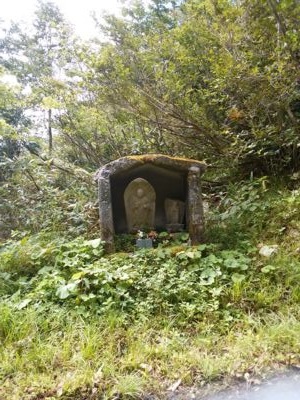 まずは酷道を堪能すべく、北上する。路面は舗装済だが、所々剥がれたアスファルトが小さい落石の如く転がっていて、油断はできない。加えて、意外と交通量多い。それも、生活道路として走っているのではなく、明らかに酷道マニアである。KDXなので追いつかれることは無いが、ブラインドコーナーから考え無しに飛び出してくる対向車には閉口した。とりあえず、峠のお地蔵様を通過。