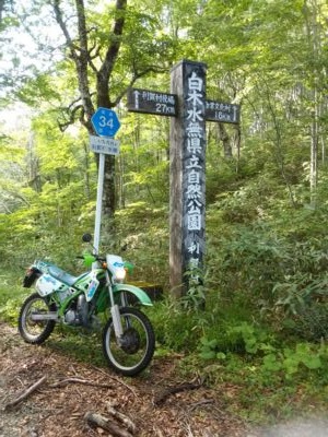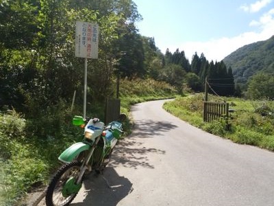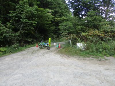 が、しかし、話はそんなに甘くは無い。牛首林道との合流点(36.35911, 136.985)で再びゲート。写真左、通行止め標識の後ろにKDXが見えている。撮影点が牛首林道との合流点、写真右側が牛首林道である。合流の数メートル手前でゲートとは、むごい。牛首林道へは落差が2~3mある直滑降なので、KDXでも降りられない。