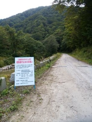 また来た道(廃道)を戻るのか、燃料は大丈夫か、いや、スタンドが開いている時間までにたどり着けるのだろうか?とか冷や汗が出てきた。この時点で既に15時半である。とりあえずダム向こう側まで行くと、こちら側のバリケードには注意書きがぶら下がっている。