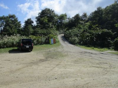 三叉路から西へは林道が1本、好奇心にそそられてこちらは入ってみることにする。車が停まっているが、金剛堂山の登山者かもしれない。