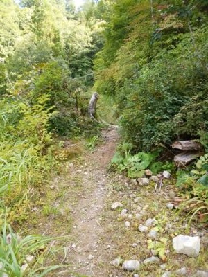 百瀬から下り、ここらから(36.39718, 137.0229)がいよいよ本番。軽トラ1台がやっとの道を進んでいく。とはいえ、離合ヶ所もほぼ無いので、車では諦めた方がいい。