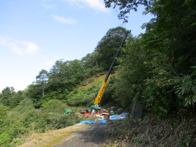 林道の方は、途中にある電波中継所を過ぎてしばらく行ったところ、林道のほぼ半ばで工事中、通行止め(36.34637, 137.00533)。ショベルカーの人に追い返されてしまった。たいていは優しく通してくれるのだが。