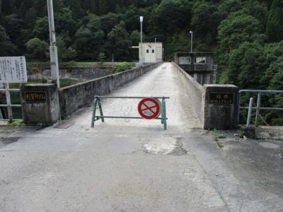 おっとり刀で来た道を戻る。廃道をとなった県道34号を、熊に怯えながら(KDXは煩いのでたぶん大丈夫だけど)水無湖へ。県道は水無湖のダム(利賀川ダム)右岸のところで真北に折れているのだが、ここで予想もしなかったゲート!