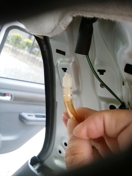 ホースはそこから運転席右外側下部、ドアの下を通っている。カバーを外してみたものの、ここまではウォッシャーが来ている様子。それではと、今度は後席右外側下部の、ドア下のカバーを外す。ここにもウォッシャーは来ている。