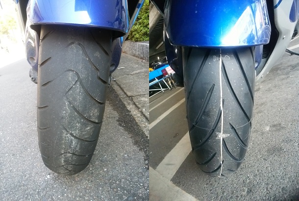 前回交換から3年。気が付けばフロントが丸坊主になっていた。ここまで走行距離12000km。リアはもう少しいけそうな気もしたが、まぁ前後合わせて交換することにした。