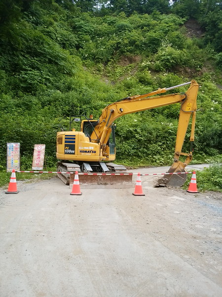 渡った先に林道があったので、時間を気にしながらも進んでいく。途中で明らかに通せんぼの重機があったが、今日は日曜日。給油の面では苦労したが、工事は休みだ。すいすいと通り抜けられるのも、バイクのいいところ。