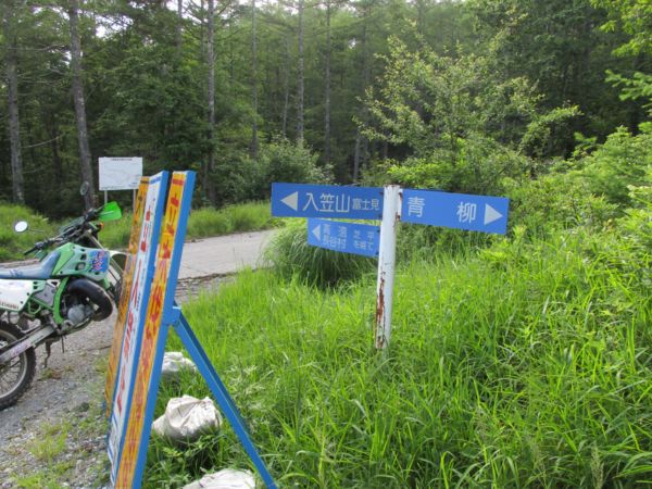 芝平峠到着、十字路になっている。上手に写真が撮れていないが、KDXの前方が本日の宿泊地、千代田湖キャンプ場に向かう舗装路。右手、「青柳」と書いてある方向が金沢併用林道、